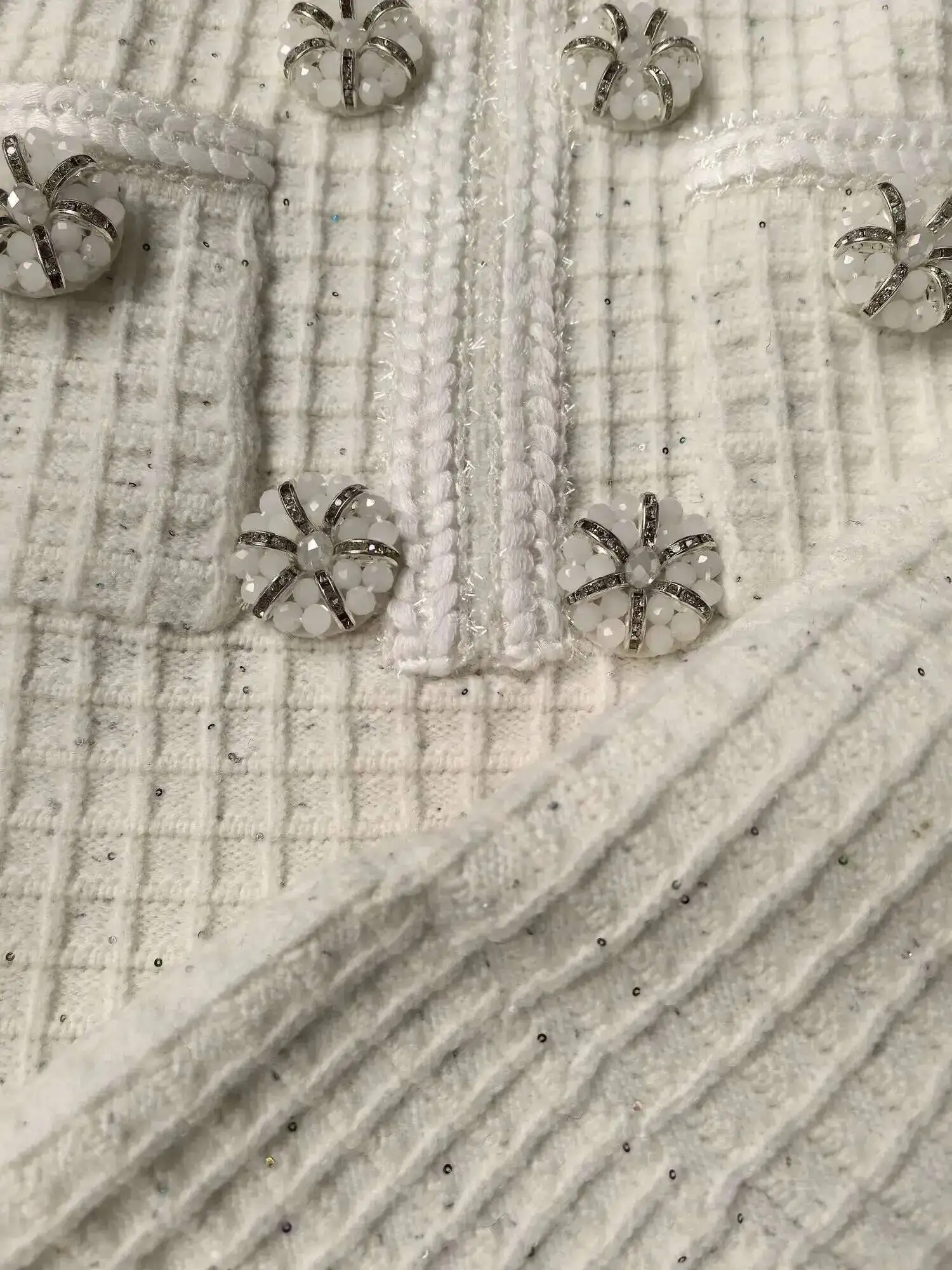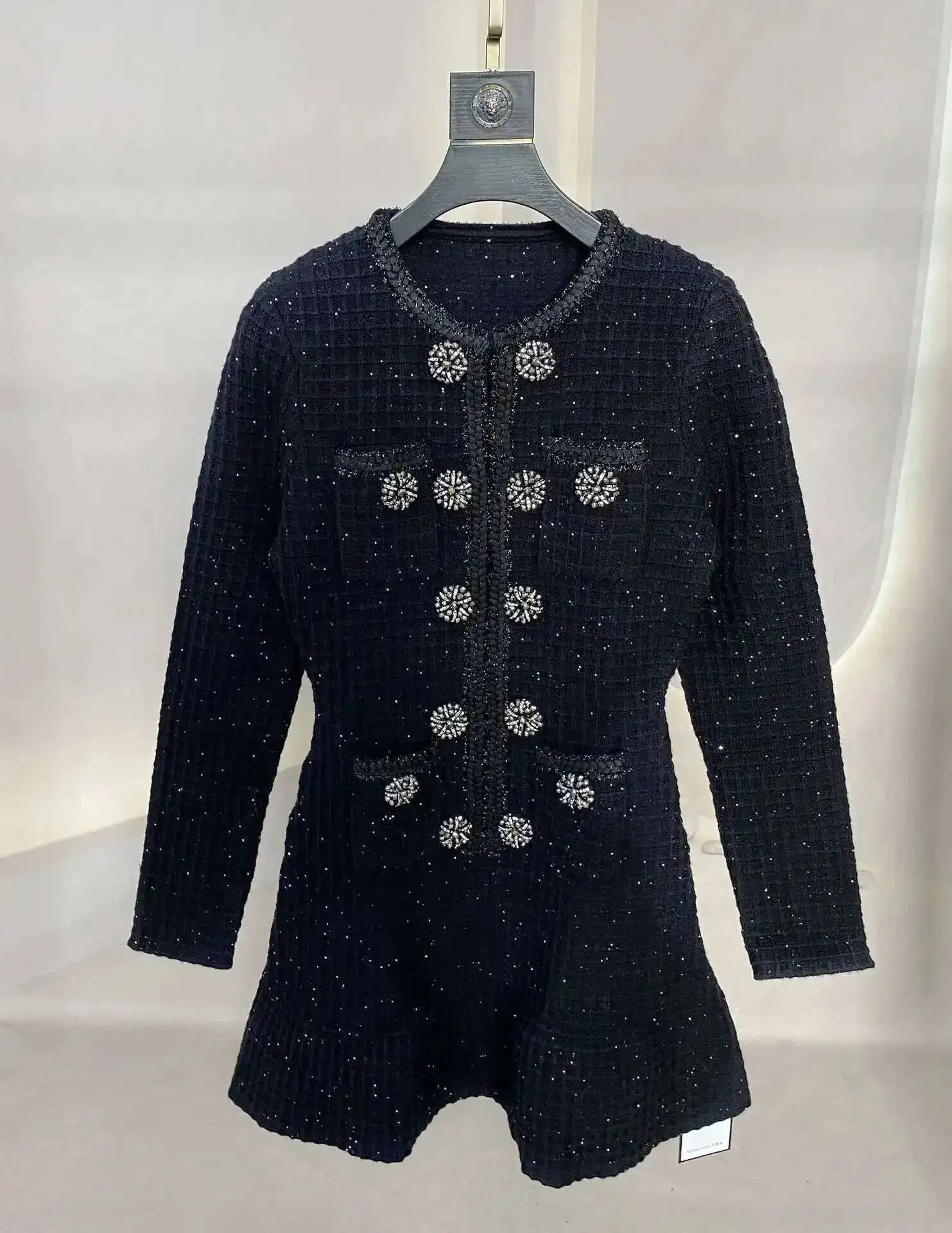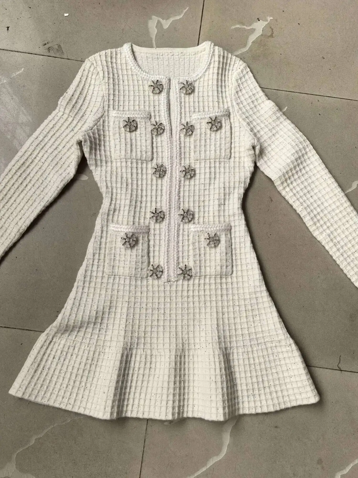 ⨠What is it - Step into elegance this autumn with our luxurious Bead Diamond Knitting Dress. This exquisite double-breasted long sleeve mini sweater dress blends style and comfort, perfect for any occasion.