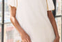 The mini dress has short puff sleeves, and a contrasted round neck.
