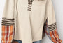 Beige Waffle Stripe Plaid Patchwork Henley Knit Top