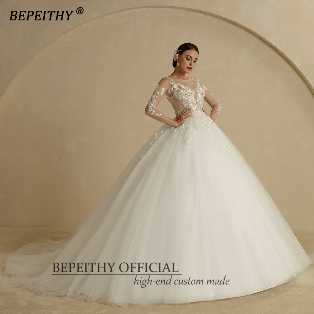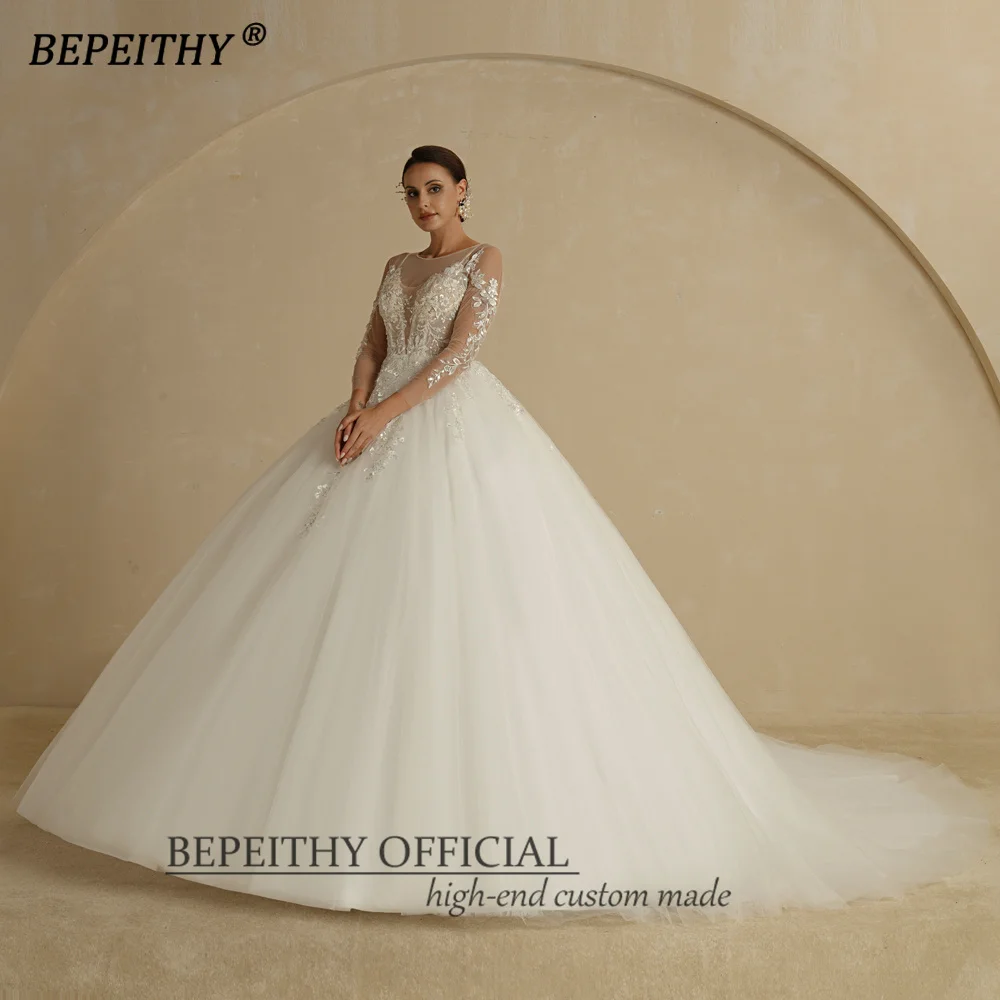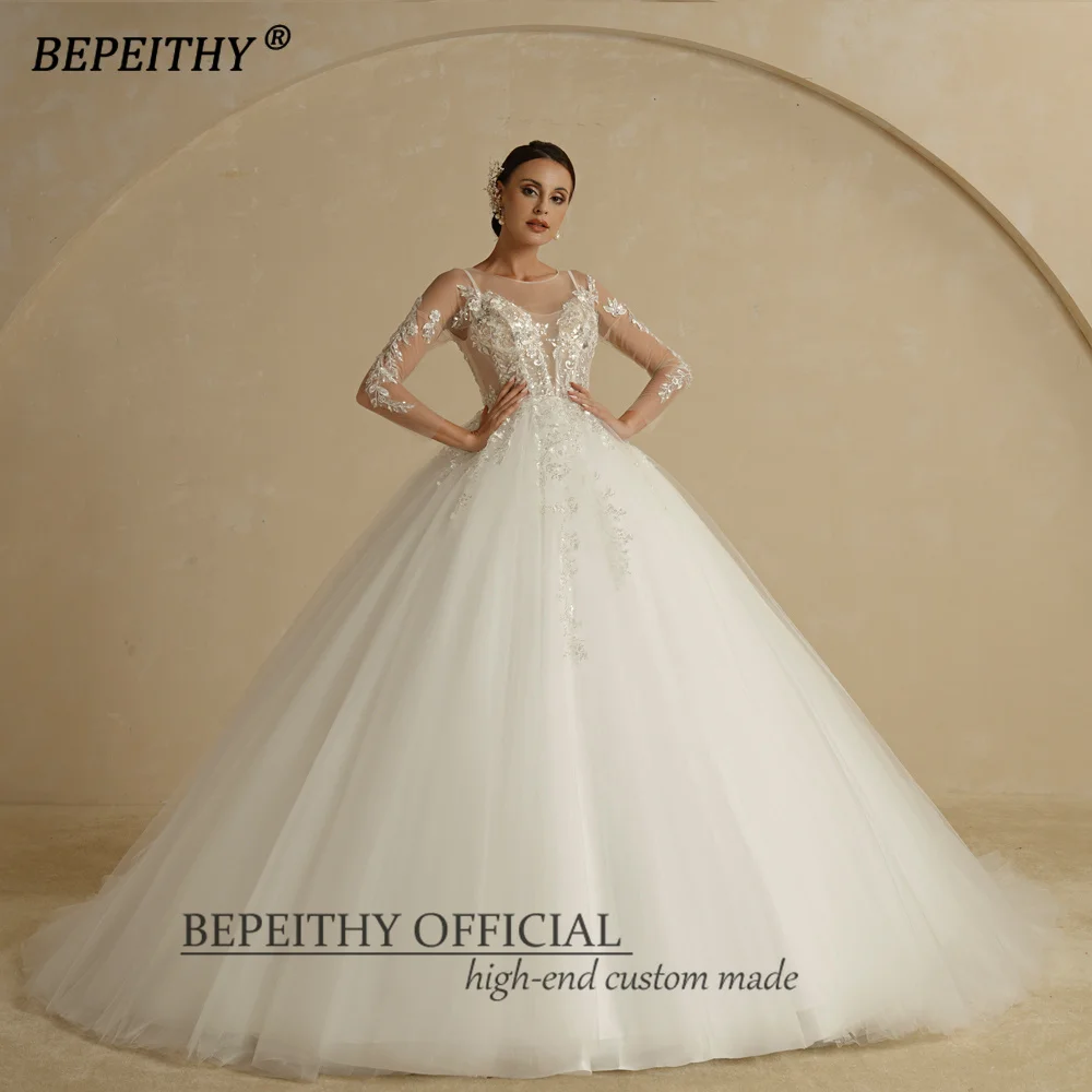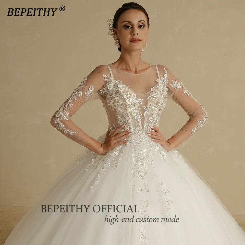 BEPEITHY Customized O Neck Sheer Top Flower Wedding Dress 2022 For Women Full Sleeves Court Train Button Back Bridal Ball Gown