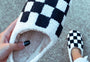 Black Checkered Print Fuzzy Slip On Winter Slippers
