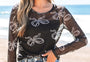 Black Round Neck Bow Print Long Sleeve Mesh Top