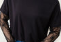 Featuring a solid tee body and sheer long sleeve patchwork.