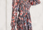 Brown Frilly Smocked Bodice Floral Mesh Long Sleeve Mini Dress