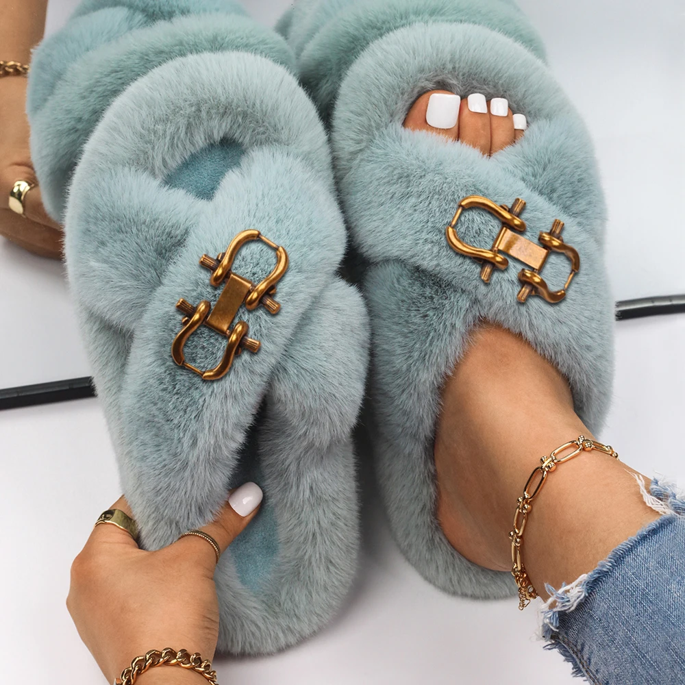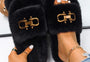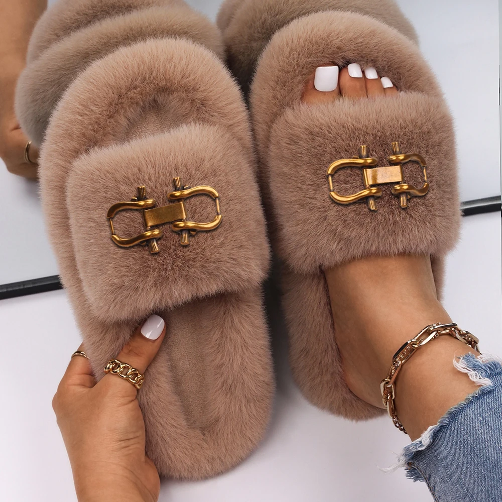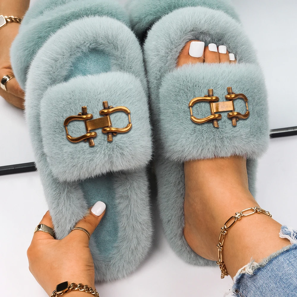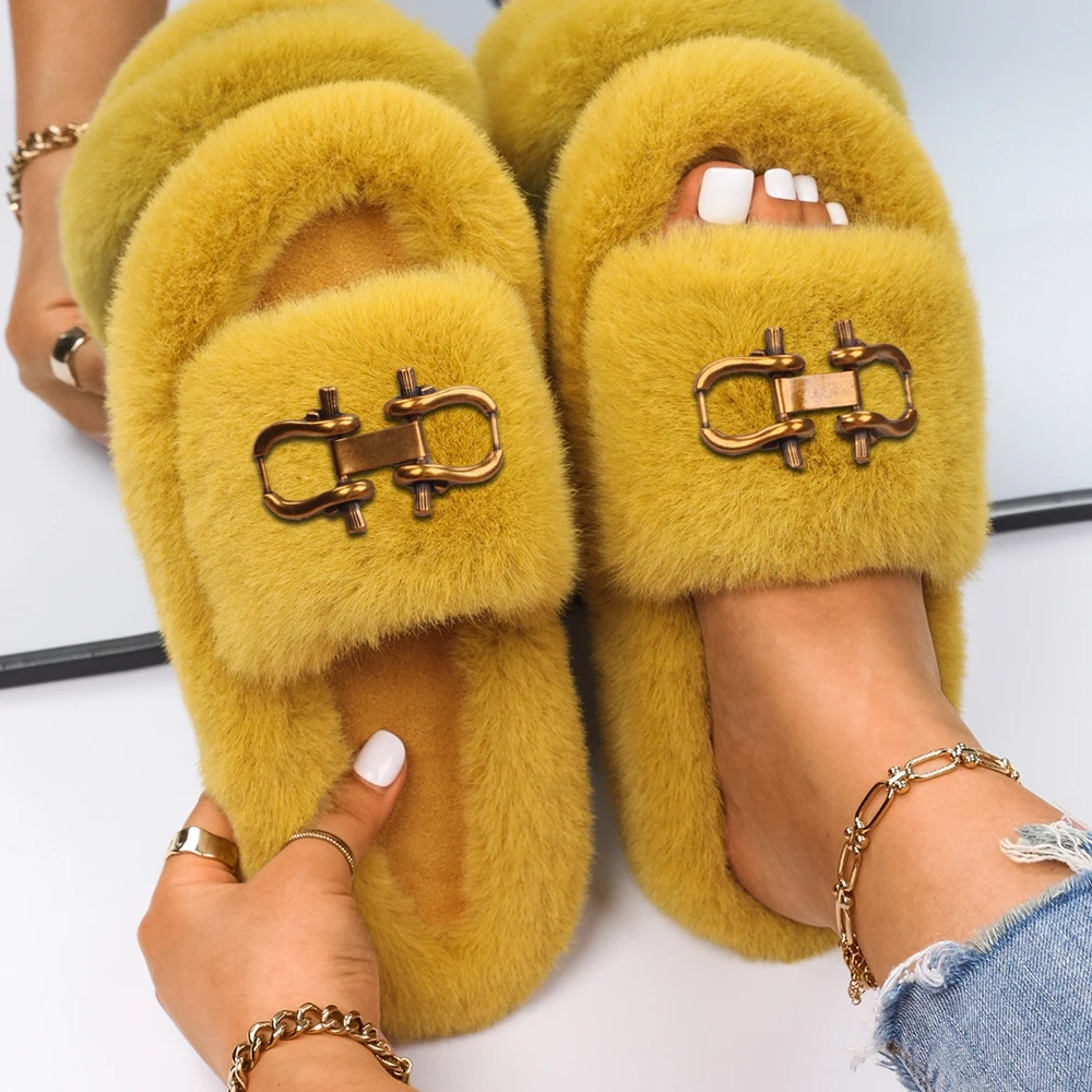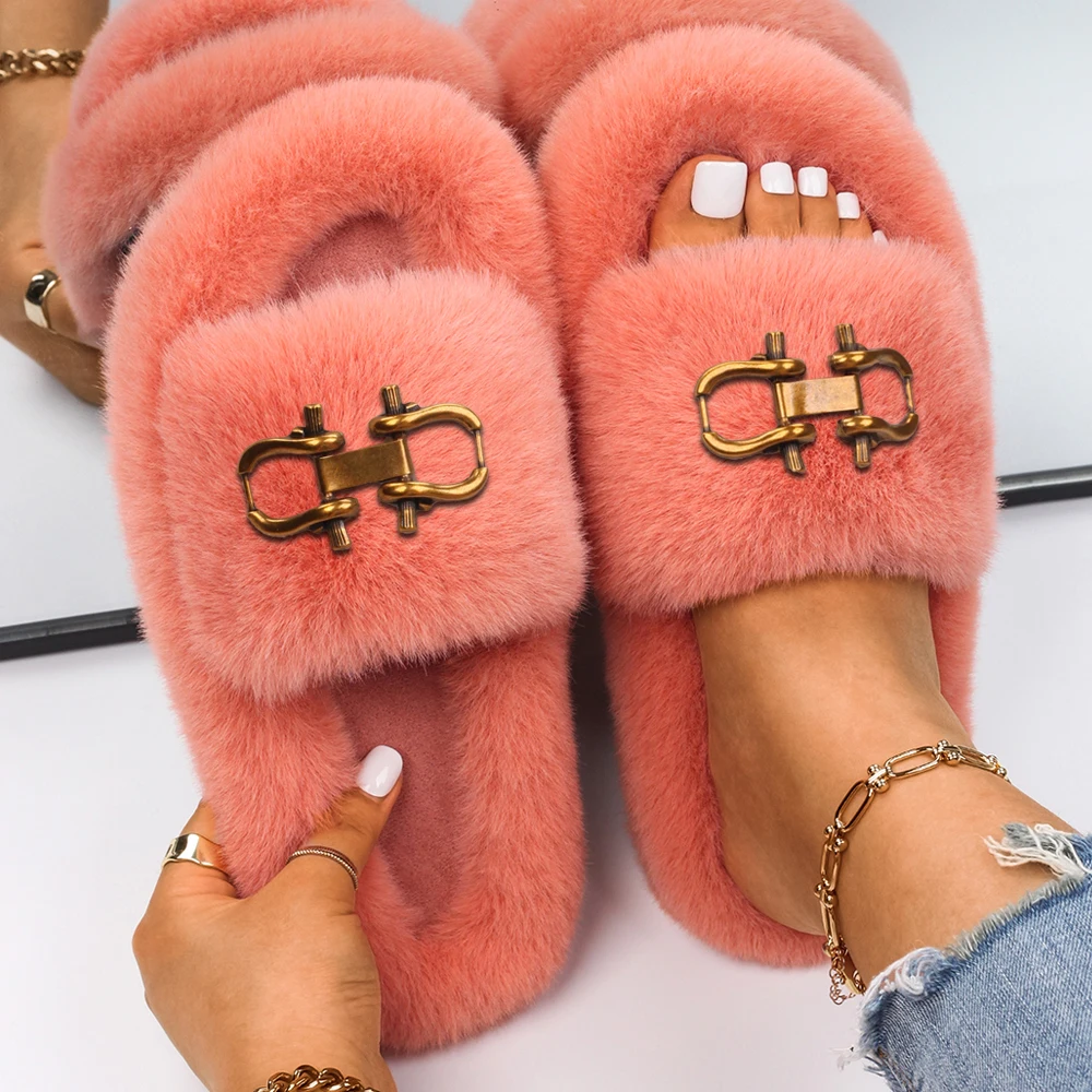 Fashion Slippers Women Buckle Decor Furry Slides Ladies Fluffy Flip Flops Luxury Designer Fur Sandals Cute Slippers Casual Shoes