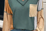 Four Leaf Clover Exposed Stitching Colorblock V Neck Long Sleeve Top