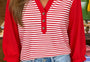 Red Stripe Half Placket V Neck Contrast 3/4 Sleeve Patchwork Top