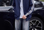 Style Three-Stripe Soft Shell Jacket for Men, Deep Blue Clean Fit Stripe Sport Coat Autumn Outdoor Wear