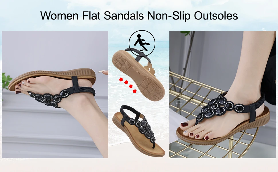 Fashionable Bohemian Style Design: This women's flat sandal features a combination of rhinestones in different colors and sizes, which can provide a unique and fashionable bohemian wearing experience; The elastic band around the ankle is easy to put on and take off; The T-clip design from toes to ankles makes your legs longer and slimmer.