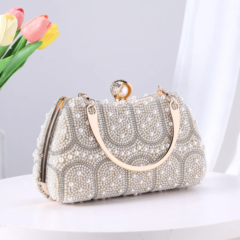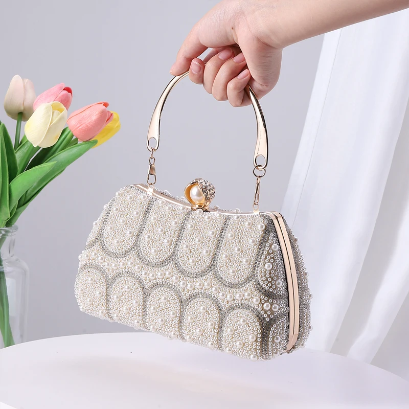 Women Pearl Clutch Bag Noble Crystal Beaded Evening Bag Wedding Clutch with Pearl Chain Handle Crossbody Shoulder Bag Handbag